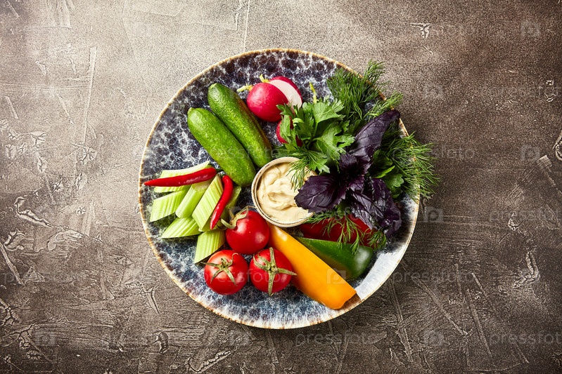 Тарелка с помидорами, сладким перцем, редисом и сельдереем, петрушкой, укропом, кинзой, зеленым луком, красным базиликом на коричневом фоне