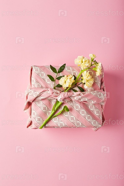 Букет желтой маттиолы с подарочной упаковкой в традиционном японском стиле фурошики. Концепция дизайна праздничного приветствия на розовом столе