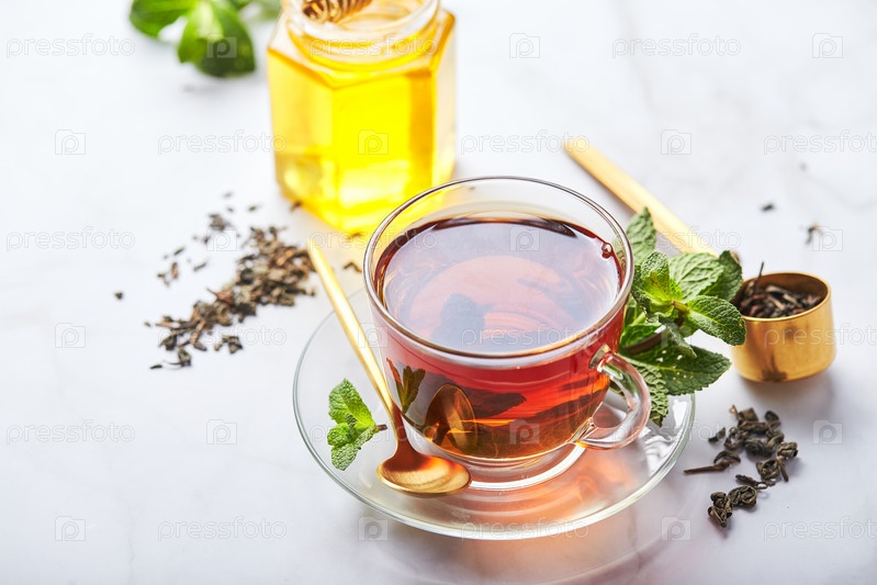 Черный чай в стеклянной прозрачной кружке с листьями мяты и медом. Успокаивающий и восстанавливающий чай, антистресс и релаксация