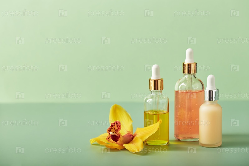 Косметические средства по уходу в стеклянных флаконах с цветами орхидеи - сыворотки, крем, гель, масла. Концепция ухода за лицом и телом, велнес и спа, тропический отдых. Косметика на цветном фоне с жесткими тенями