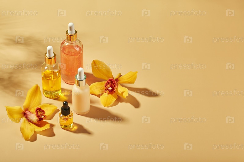 Косметические средства по уходу в стеклянных флаконах с цветами орхидеи - сыворотки, крем, гель, масла. Концепция ухода за лицом и телом, велнес и спа, тропический отдых. Косметика на цветном фоне с жесткими тенями