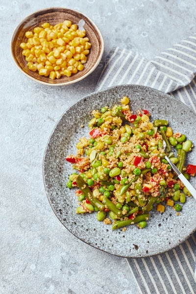 Салат из киноа с зеленой фасолью, кукурузой, красным перцем, горошком и соей. Полезная овощная смесь