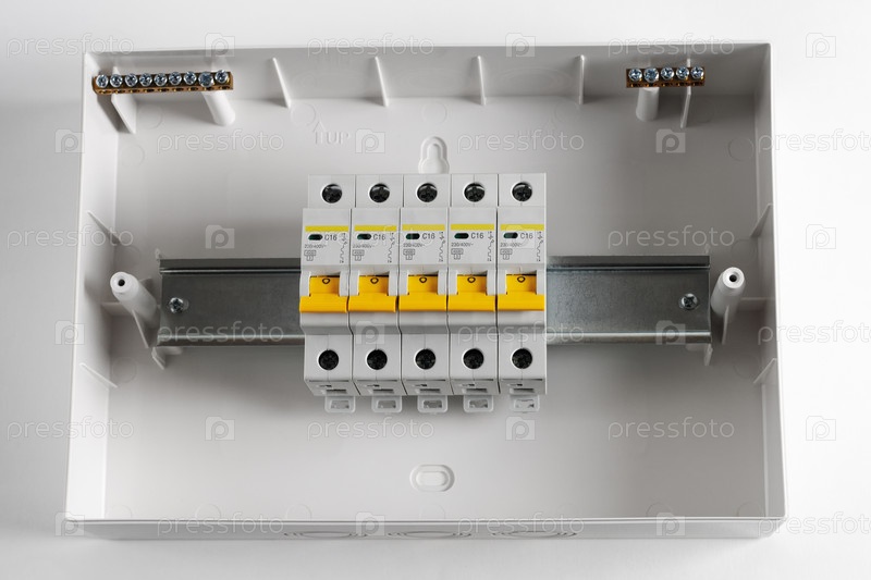 Пластиковый распределительный щит. Электрощит. Крупный план. Изолированные на светло-сером фоне