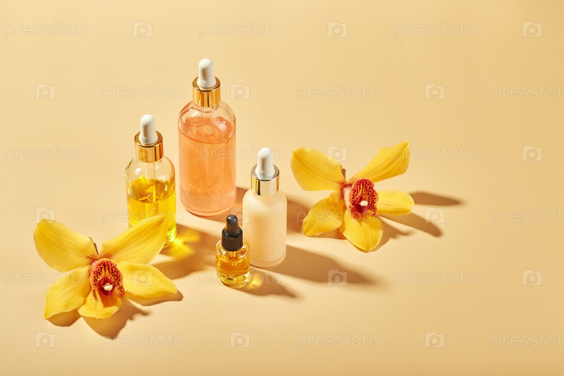 Косметические средства по уходу в стеклянных флаконах с цветами орхидеи - сыворотки, крем, гель, масла. Концепция ухода за лицом и телом, велнес и спа, тропический отдых. Косметика на цветном фоне с жесткими тенями