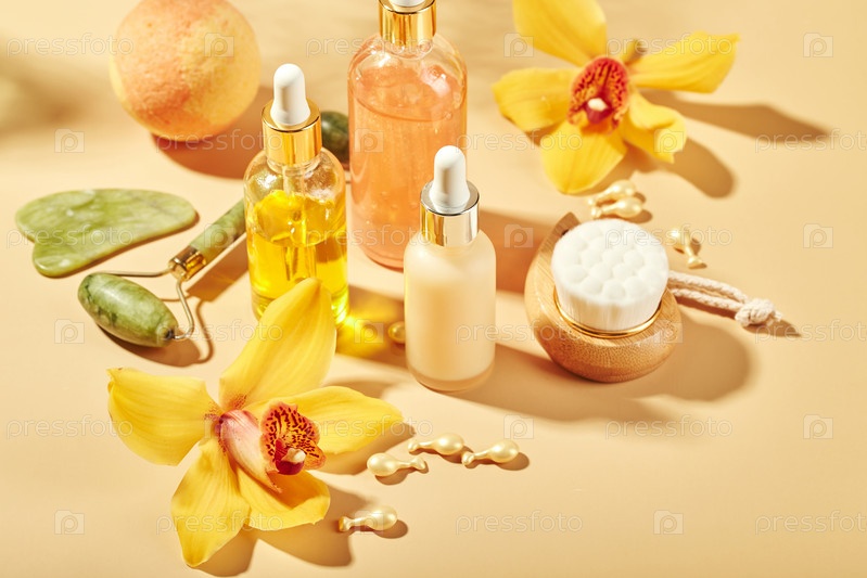 Косметические средства по уходу в стеклянных флаконах с цветами орхидеи - сыворотки, крем, гель, масла. Концепция ухода за лицом и телом, велнес и спа, тропический отдых. Косметика на цветном фоне с жесткими тенями