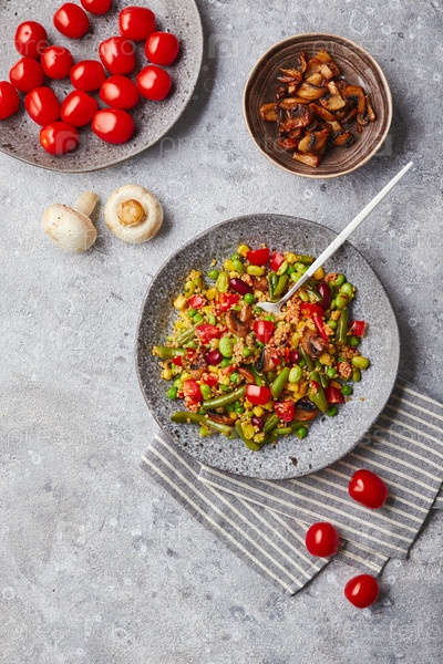 Киноа со стручковой фасолью, помидорами, жареными шампиньонами, кукурузой, красным сладким перцем, горошком и соей. Полезная овощная смесь