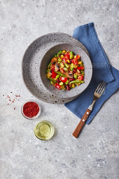 Киноа со стручковой фасолью, помидорами, жареными шампиньонами, кукурузой, красным сладким перцем, горошком и соей. Полезная овощная смесь