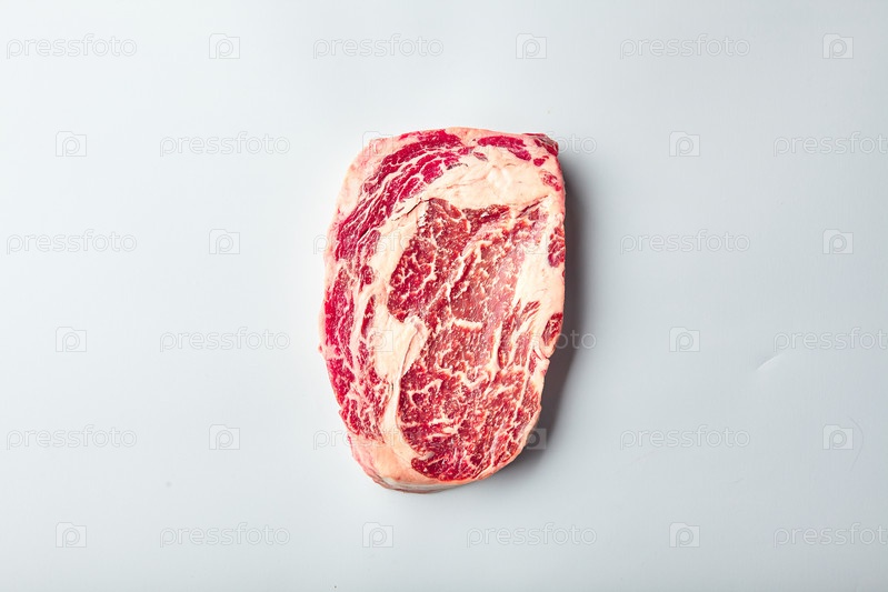 Рибай стейк из мраморной говядины зернового откорма лежит на белом фоне. Мраморная говядина, вид сверху