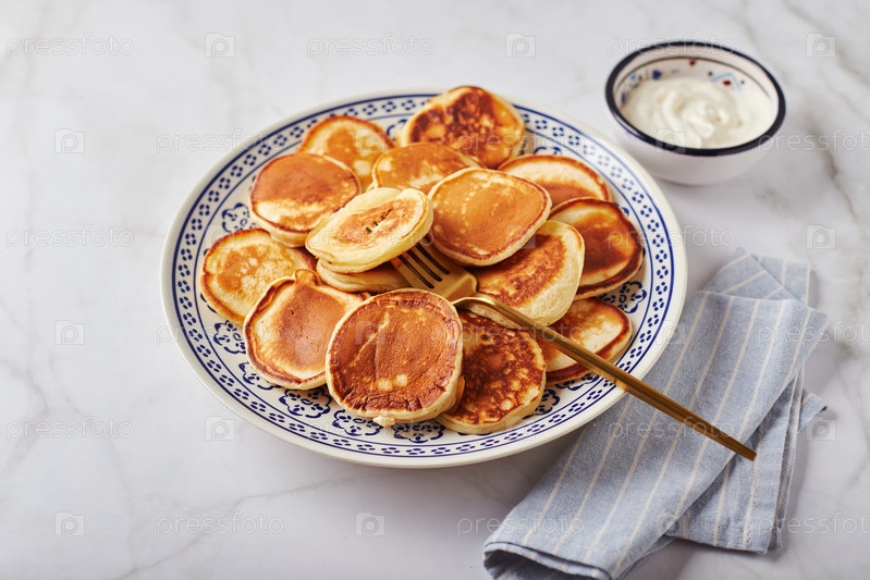 Сладкие блинчики со сметаной на тарелке на белом столе