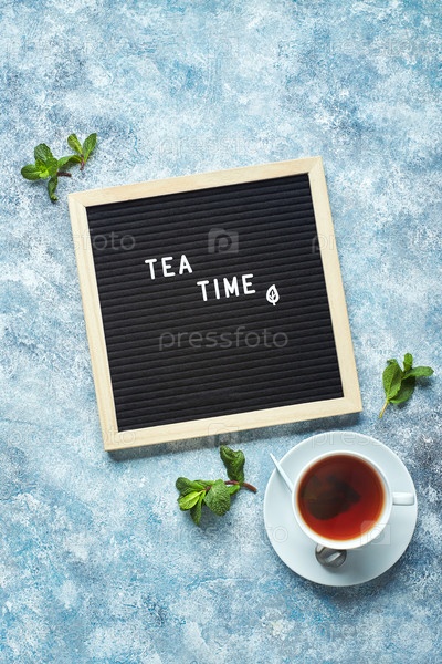 Время чая. Черная доска для писем с текстом на синем столе со стеклянной чашкой чая с листьями мяты