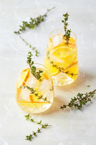 Освежающий коктейль со льдом, апельсином и тимьяном. Освежающий летний домашний алкогольный или безалкогольный коктейль или моктейль или ароматизированная вода на основе Детокса