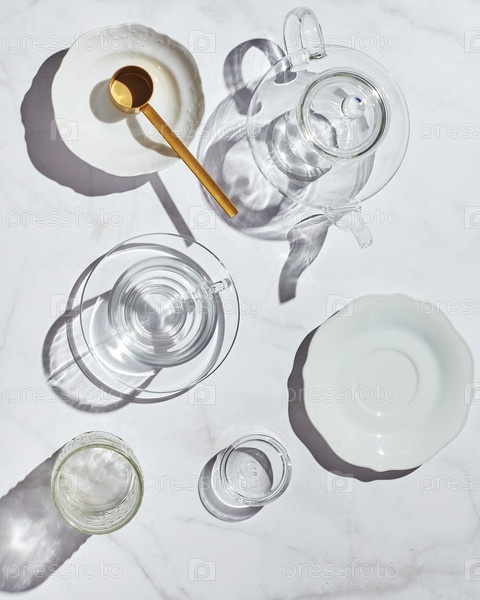 Высокий угол обзора стеклянной посуды для чайного оттенка на белом столе в солнечный день