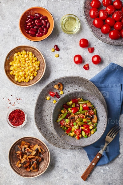 Киноа со стручковой фасолью, помидорами, жареными шампиньонами, кукурузой, красным сладким перцем, горошком и соей. Полезная овощная смесь