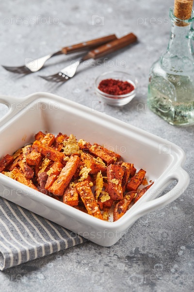 Сладкий картофель с сыром в миске на сером фоне