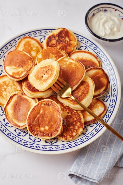 Сладкие блинчики со сметаной на тарелке на белом столе