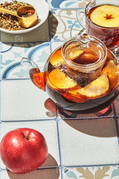 Фруктовый чай с яблоками и тимьяном в стеклянном чайнике и чашка на столе из цветной плитки с жесткими тенями
