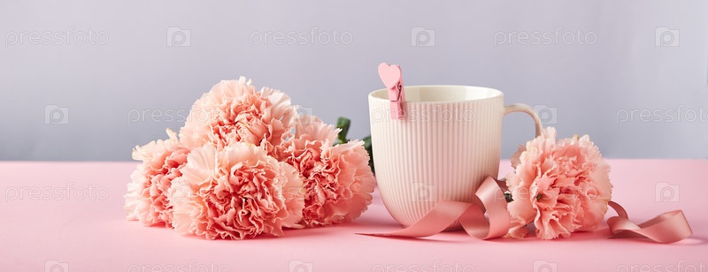 Букет розовых гвоздик и белая чашка. Концепция дизайна праздничного приветствия с букетом гвоздик на розовом и синем фоне