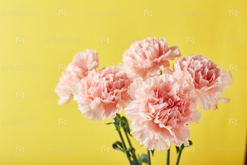 Букет розовых гвоздик. Концепция дизайна праздничного поздравления с букетом гвоздик на желтом фоне