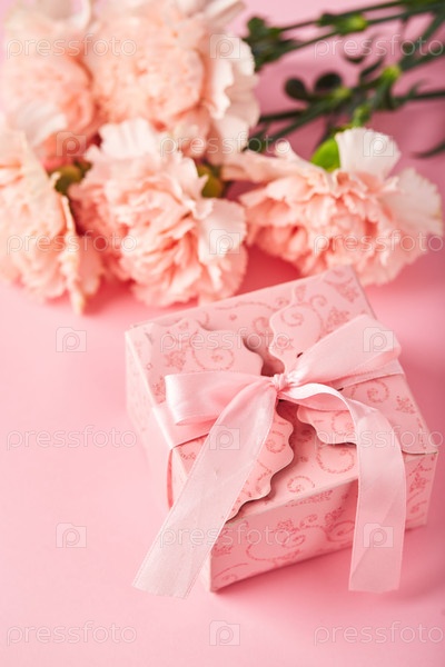 Букет розовых гвоздик и розовая подарочная коробка. Концепция дизайна праздничного поздравления с букетом гвоздик на розовом фоне