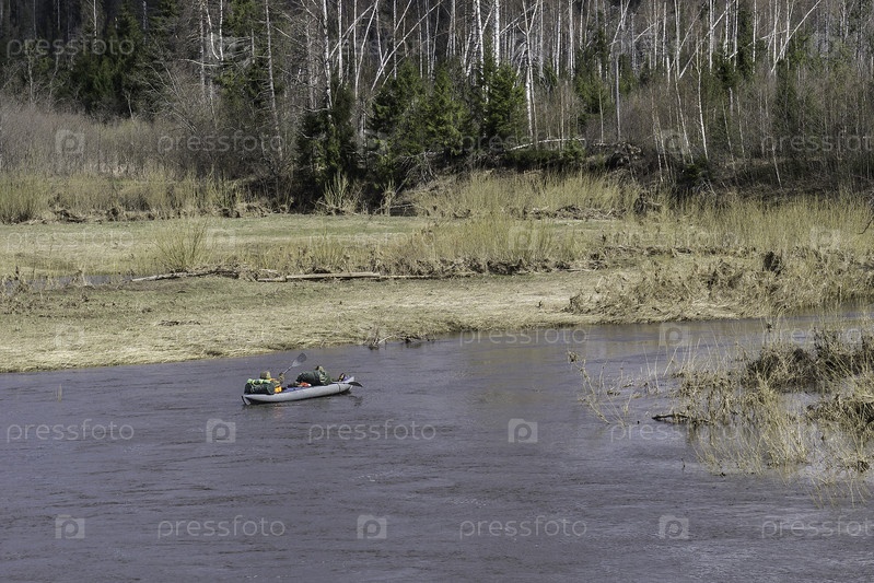 Сплав по реке на резиновой лодке. Рафтинг. Двое плывут в лодке по реке в солнечный весенний день