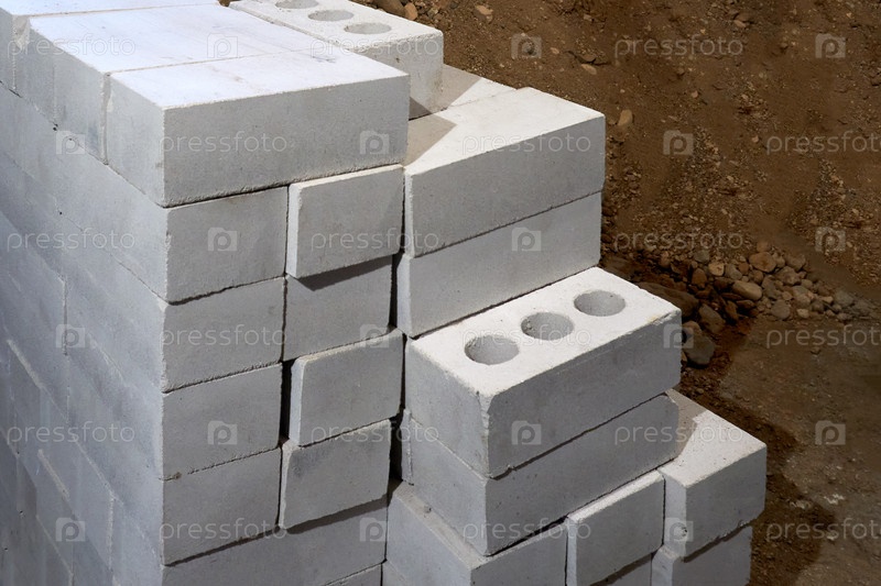 Несколько кусков белого силикатного кирпича были сфотографированы на фоне песчано-грунтовой смеси. Стопка кирпичей. Подготовка к возведению кирпичной стены