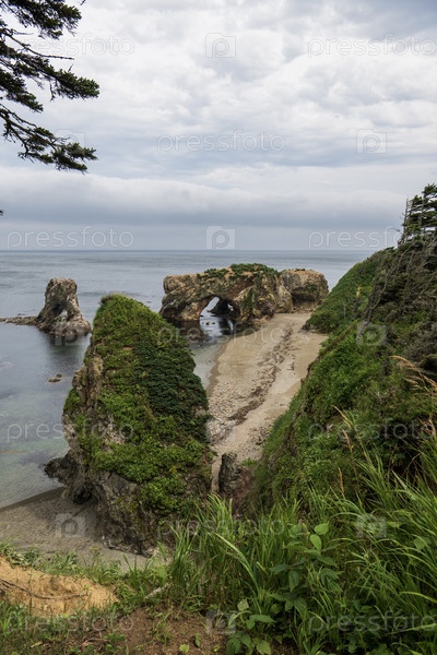 Вид на пляж и скалы в пасмурный летний день