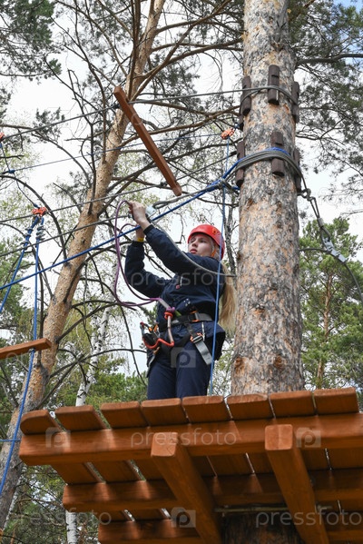 Девочка-подросток проходит препятствие в веревочном парке