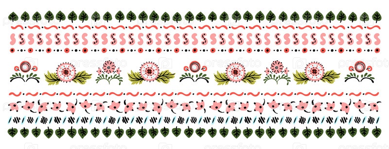 Набор этнических элементов. Бордюр представляет собой полосу с цветами, листьями, ветками, вензелями. Народная вышивка. Славянский, украинский, русский мотив. Хохлома, матрешка, дымковская игрушка. Мексиканский, индийский, цыганский ковер. Вязаное кружево