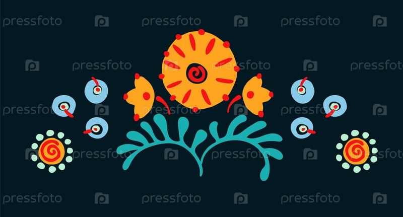 Набор этнических элементов. Бордюр представляет собой полосу с цветами, листьями, ветками, вензелями. Народная вышивка. Славянский, украинский, русский мотив. Хохлома, матрешка, дымковская игрушка. Мексиканский, индийский, цыганский ковер. Вязаное кружево
