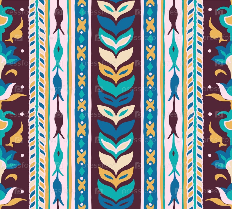 Геометрический дамасский орнамент. Икат границы. Этническая вышивка с листьями и монограммами. Племенная векторная текстура. Бесшовный народный узор в ацтекском стиле. Индийский, скандинавский, цыганский, мексиканский, африканский ковер