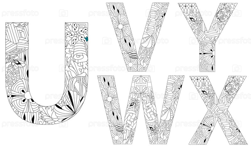 Художественный дизайн ручной росписи. Красочный ручной рисунок алфавита для раскраски страниц. Часть 5