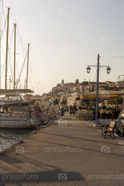 Вид на набережную и яхты острова Парос (Греция) весенним вечером