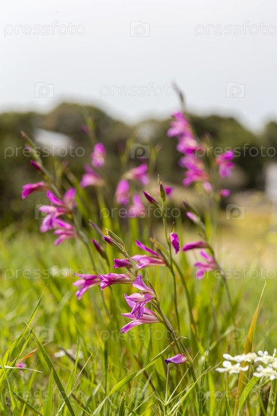Дикий гладиолус (Gladiolus communis) растет на лугу в солнечный весенний день