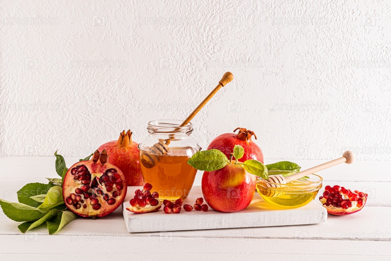 Традиционные продукты для еврейского новогоднего праздника. мед, гранат, яблоки на деревянной белой доске и столе. Концепция Рошашан