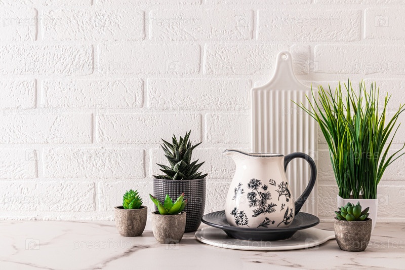 Красивый кухонный фон в серых и белых тонах с кухонной утварью и посудой. Белая кирпичная стена в современном интерьере кухни