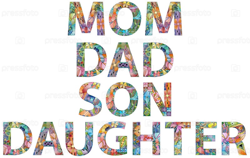 Художественный дизайн ручной росписи.Ручное изображение слов MOM DAD DAD SON DAUGHTER для футболок и других украшений