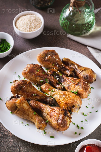 Аппетитные запеченные куриные ножки с луком и семенами кунжута на тарелке вертикальный вид