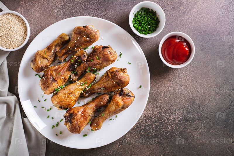 Острые запеченные куриные ножки с зеленым луком и кунжутом на тарелке сверху