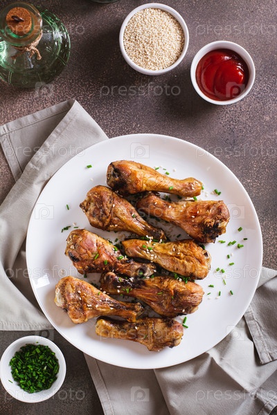 Аппетитные запеченные куриные ножки с зеленым луком и семенами кунжута на тарелке и вертикальном виде