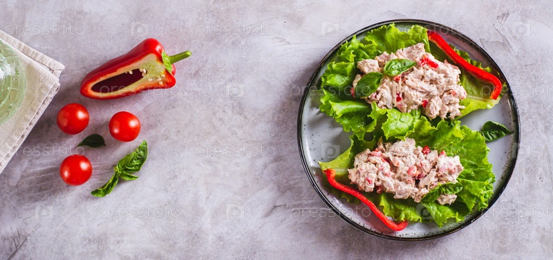 Салат из консервированного тунца с перцем и яйцом на листьях салата на тарелке вид сверху веб-баннер