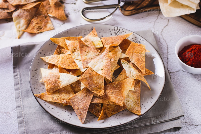 Острые чипсы с паприкой и укропом из тортильи на тарелке