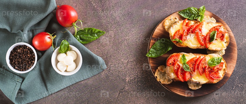 Бутерброды с запеченными булочками с помидорами, моцареллой и базиликом на доске, вид сверху, веб-баннер