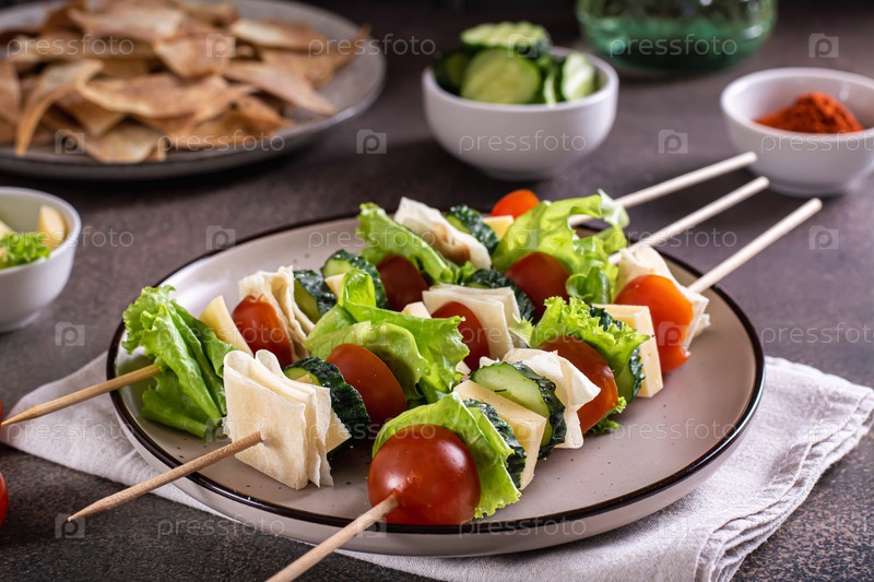 Закуска на шпажках из помидоров, огурцов, сыра, лаваша и салата на тарелке