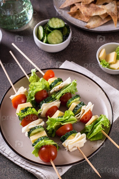 Свежий помидор, огурец, сыр, лепешка и канапе из салата на тарелке по вертикали