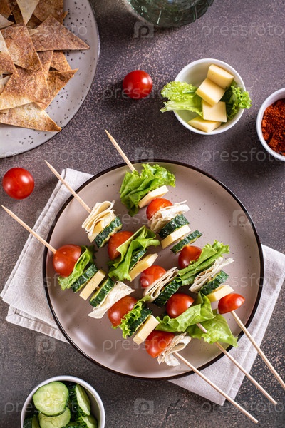 Свежий помидор, огурец, сыр, лепешка и канапе из салата на верхней части тарелки и вертикальный вид