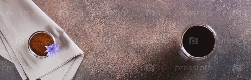 Напиток из цикория в чашке, порошок и цветок на столе, вид сверху, веб-баннер