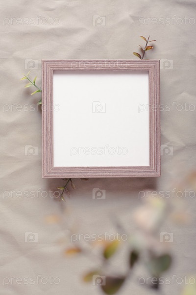 Макет пустой фоторамки и веток на зеленой хлопчатобумажной ткани сверху и вертикальный вид