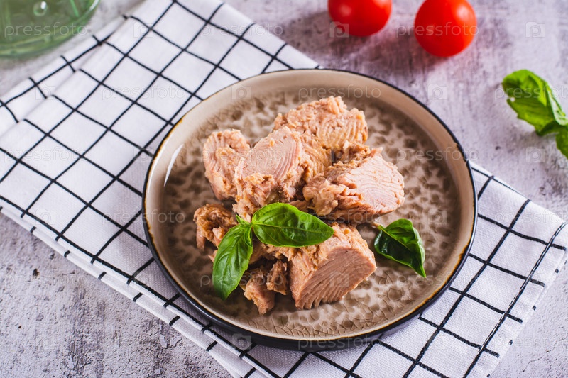 Консервированное мясо тунца и базилик на тарелке на столе