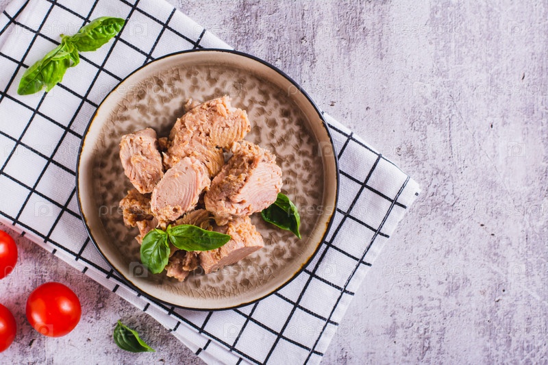 Кусочки консервированного тунца и листья базилика на тарелке сверху