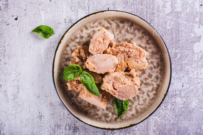 Крупный план кусочков консервированного тунца и листьев базилика на тарелке сверху